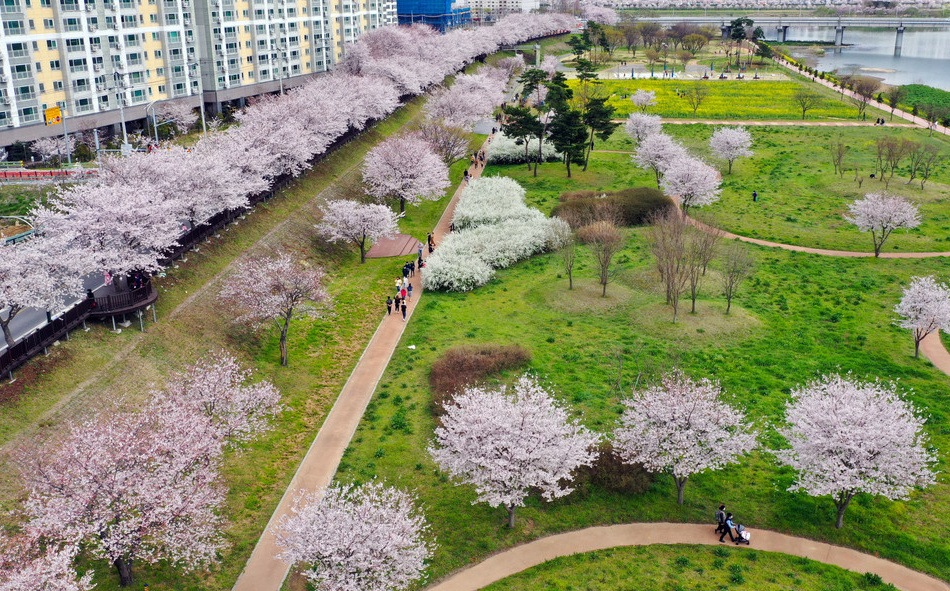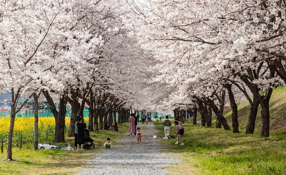 강바람에 휘날리는 하얀 눈꽃을 맞으며 5km에 달하는 수변공원을 따라 걷다보면 벚꽃과 함께 빠질수없이 피어나는 유채꽃과 조팝나무의 앙상블에 더욱 다채로운 봄의 향연이 펼쳐져 있다.