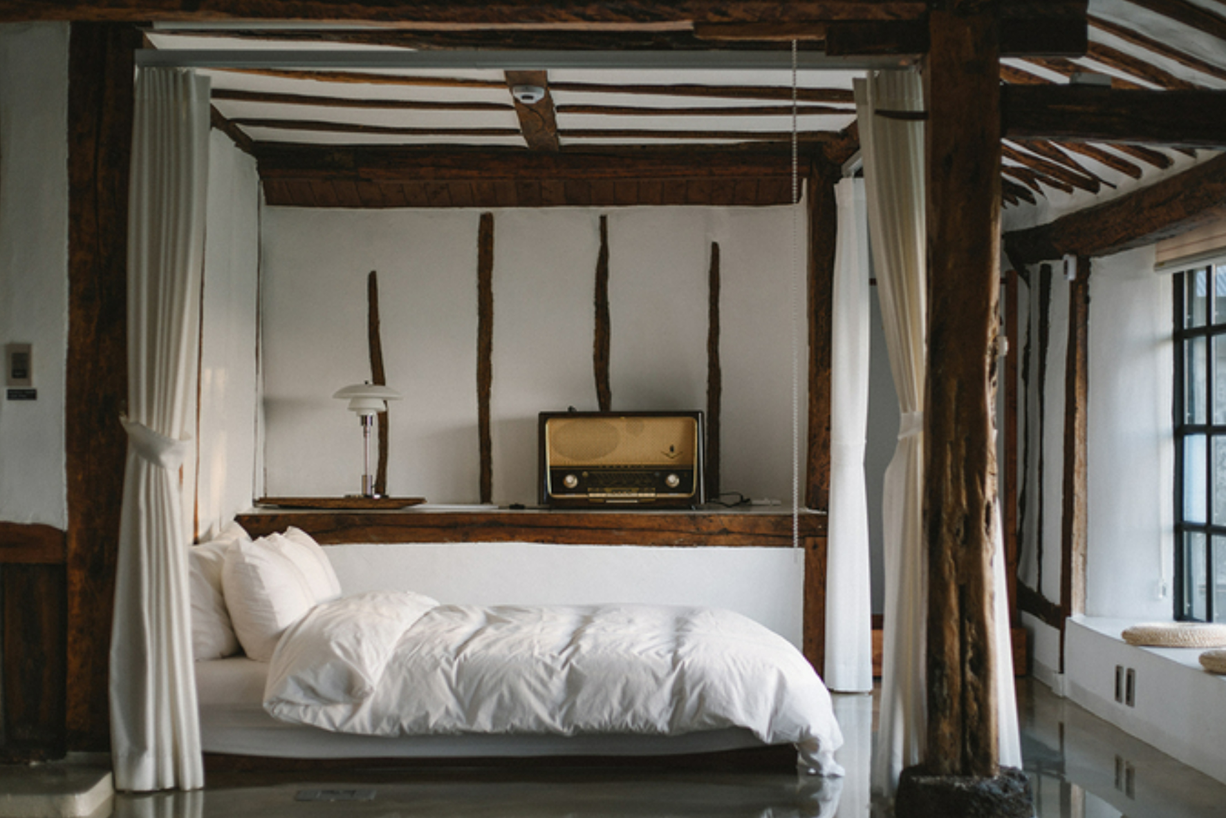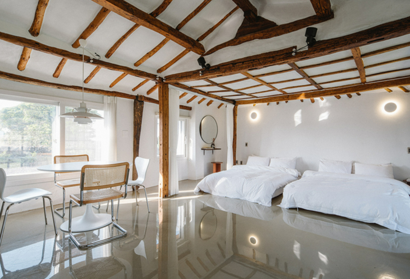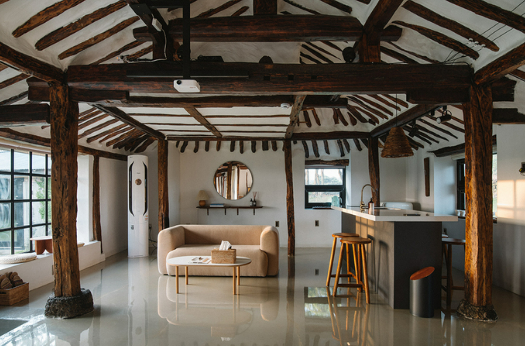 각 공간은 전통 가옥의 구조 기능을 이어받았기 때문에 과거와 현재의 변화가 주는 흔적을 찾는 재미도 있습니다. [냉장고가 없었던 시절, 집안의 권력의 서열이 가장 높은 어르신들이 생활했던 공간이기도 한 이곳에는 남겨진 고팡의 목문을 볼 수 있다. 모커리동의 천정은 회벽의 흰색과 오랜 시간 제주의 굴묵 난방으로 훈연된 나무의 색감이 어우러져 한 폭의 동양화가 그려진 것만 같다] 세월의 흔적이 고스란히 느껴지는 서까래와 모던한 에폭시 바닥의 조화가 근사하게 어우러지죠? 또 외양간이었던 키친동은 이제 빵 굽는 내음이 가득한 공간으로 변신했다고 덧붙였습니다.