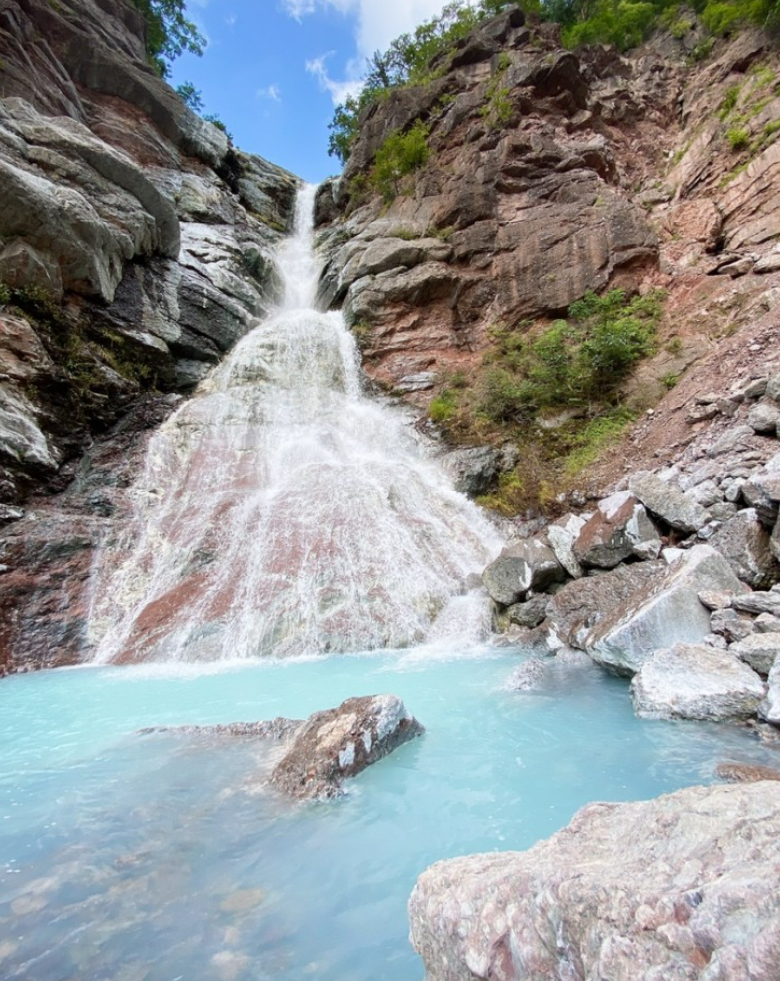 석회질 성분으로 물의 색상이 다른 곳과는 달리 밀키스 색상을 띄고 있기 때문이다.