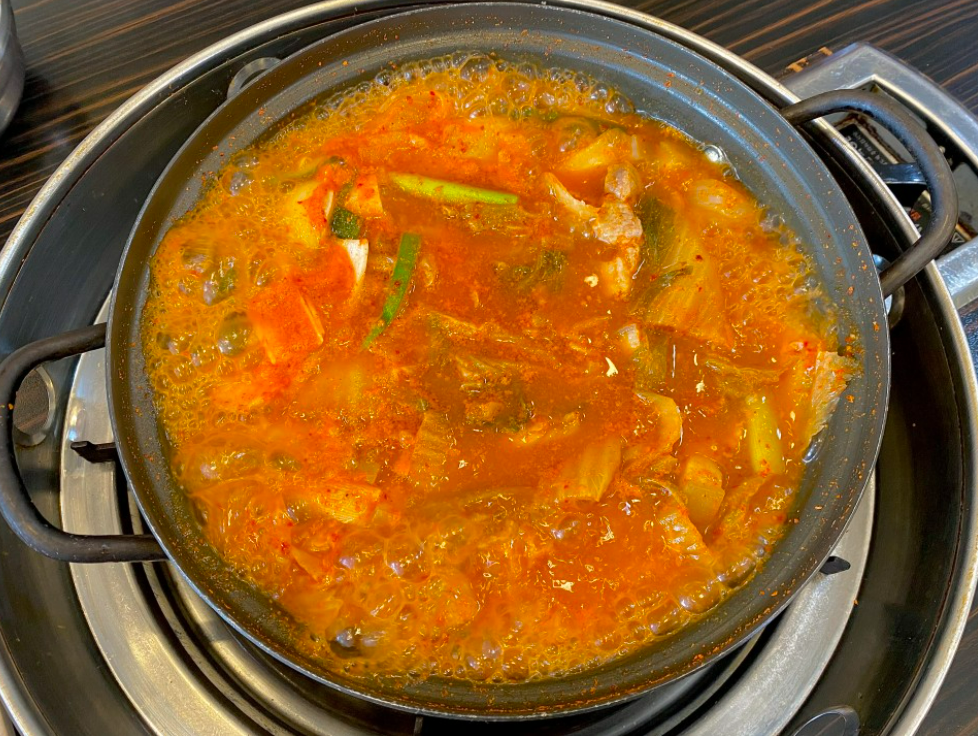 김치는 노릇노릇해질 때까지 볶다가 노릇노릇해지면 모든 재료를 넣고 끓인다.