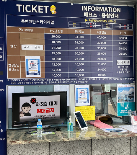 죽변해안스카이레일에 탑승하기 위해서는 발열 체크 후 현장 발권을 마쳐야 한다. 100% 선착순이므로 오는 순서에 따라 탑승 시간이 정해진다. 모노레일은 최대 4인승이다. 한두 명이 오더라도 일행끼리만 탑승 가능하니 사회적 거리 두기 지침도 실천할 수 있다.