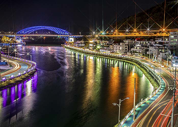 통영대교는 밤에 야경을 즐기기 좋은 장소로 경관조명이 설치되어 있다.