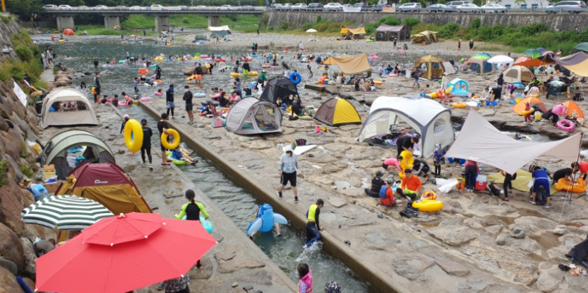 통영대전 고속도로 단성 IC를 나와 이곳 삼장교까지 오는 도중에도 산청에는 좋은 계곡이 많습니다.하지만 이렇게 사람이 붐비고 축제가 열리는 듯한 풍경은 볼 수가 없었는데 삼장교 자연유수풀이 인기 있는 장소임에는 틀림없습니다.
