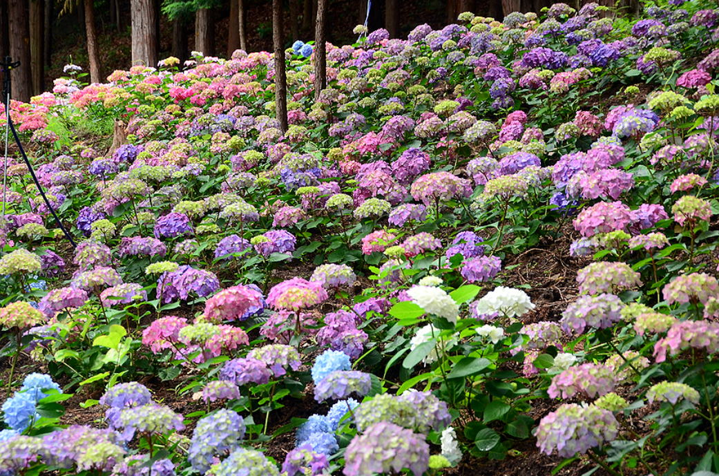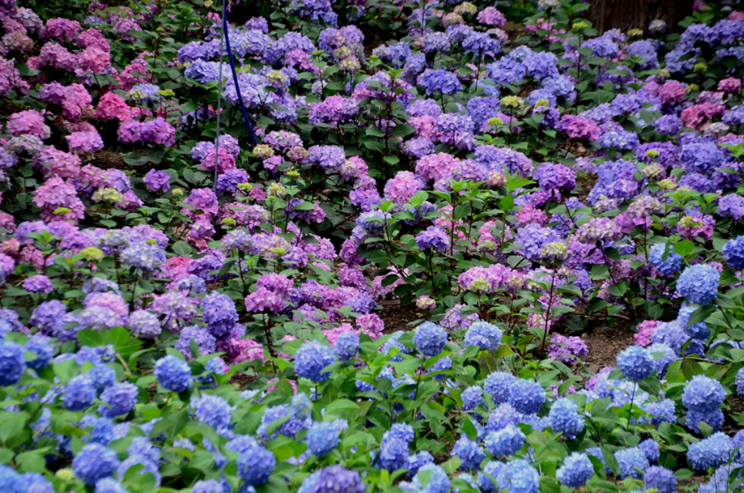 토양의 산성이 높을수록 청색을, 낮을수록 붉은색을 띠는 등 색이 달라지는데 보성 윤제림의 수국은 무지개 밭을 이루어