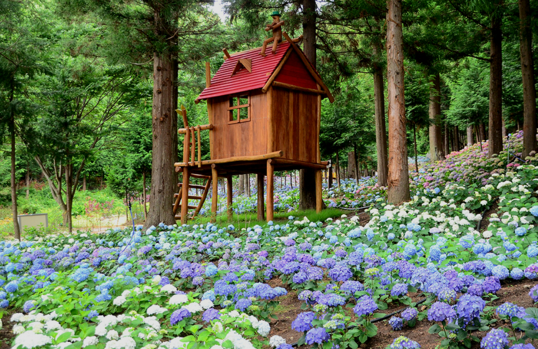 보성에 윤제림은 편백나무의 숲속에 파스텔톤으로 화사하게 만개한 팝콘 수국밭 이 조화를 이루어 마치 동화 속에 온 것 같은 장관을 이룬 곳입니다!