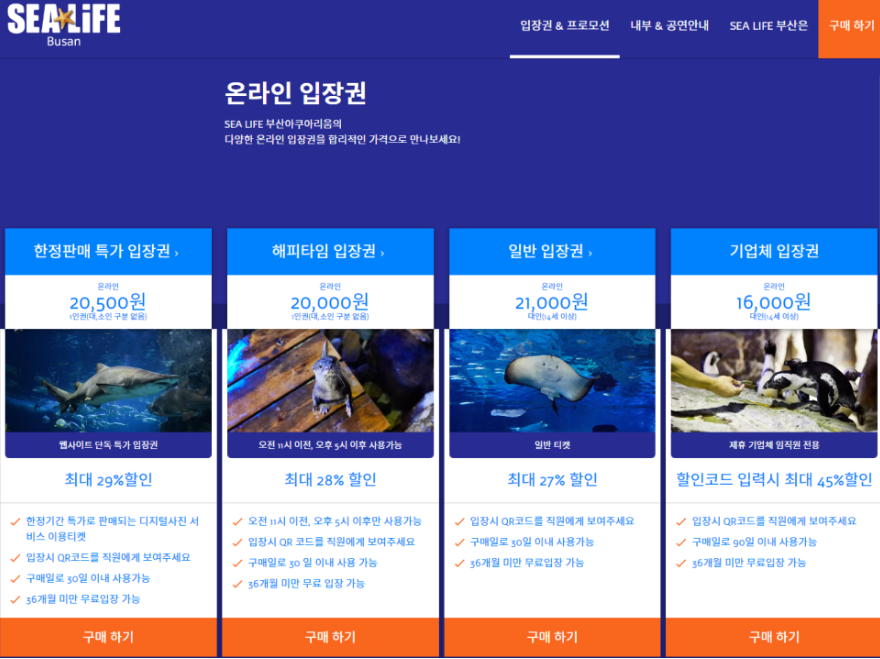 250종, 10000여 마리의 해양생물들을 전시하고 세계 최첨단 디지털 기술이 어우러진 10여개의 다양한 전시존을 자랑합니다. 매일 10시에 오픈 끝날 무렵 6시 전에는 입장을 하셔야 합니다.