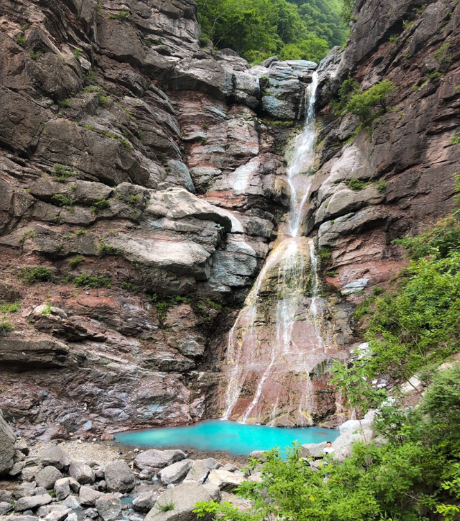 신비로운 물의 색상 덕분에 여러 별명이 생긴 '밀키스 폭포, 뽕따 폭포'라고 불리기도 하는 삼척의 미인폭포다.