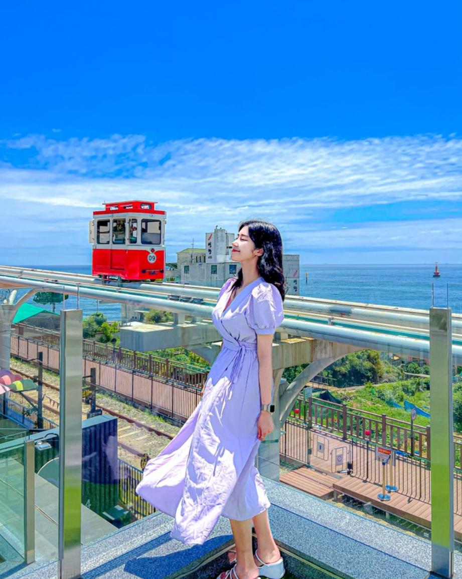 가장 예쁘게 나오는 장소는 개인적으로 테라스 왼쪽 모서리이니 우선 선점해야합니다. 취향을 저격한 색 열차와 함께 사진을 한 컷 남기면 해운대의 멋찐 추억이 완성됩니다.