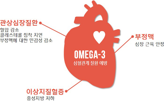 또 초기 심혈관질환자에게 오메가3 캡슐을 하루 0.5~0.8g 추가 섭취하게 했을 때 심근경색 사망률이 현저히 떨어졌다는 내용도 유명한 연구결과다.