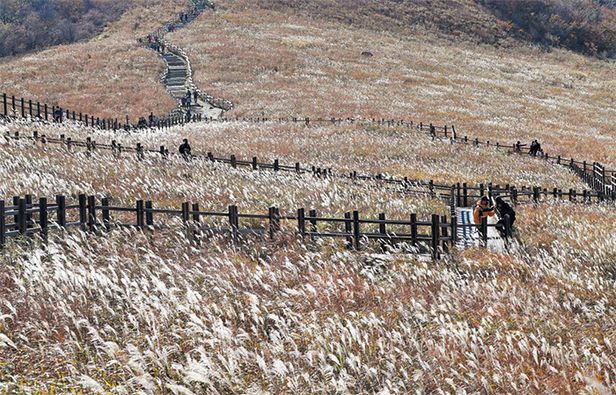 도착하는 순간 은은한 황금빛으로 물든 억새평원이 펼쳐져 있는 이색적인 풍광을 구경할 수 있어서 힘듦이 잊혀졌고요. 그 사이로는 산책로를 만들어 놔서 쉬엄쉬엄 주변 풍경을 감상하면서 걷기 좋았어요.
