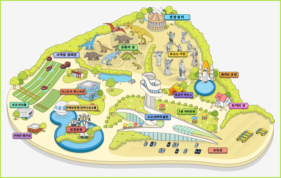 옥토끼우주센터는 우주, 공룡, 로봇을 주제로 하는 과학 문화 콘텐츠 공간입니다. 항공기술의 역사가 담긴 항공우주과학관, 움직이는 공룡과 로봇이 있는 상상체험공원으로 구성되어 있습니다. 또한 사계절 썰매장과 물놀이 시설, 로고스 가든 등의 엔터테인먼트 시설로 온 가족이 즐거운 추억을 만들 수 있습니다.