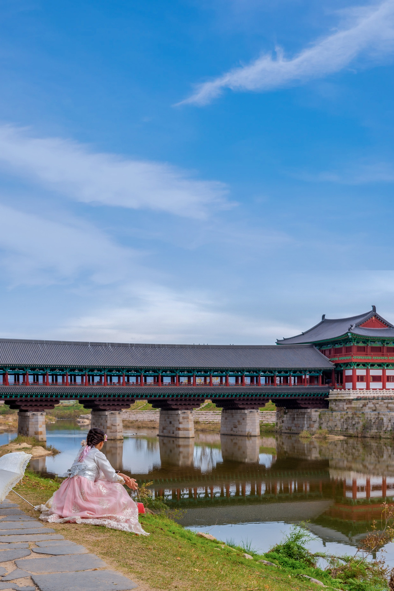 남천(문천) 위를 수놓고 선 그림과도 같은 목조교량 경주 월정교입니다.