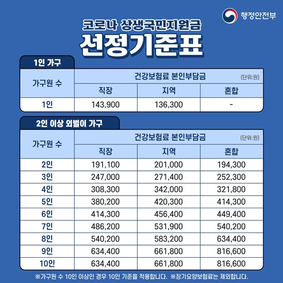 2인 이상 맞벌이 가구는 가구원이 한 명 더 있는 것으로 간주하기로 했다. 즉 3인 외벌이 가구와 같은 기준이 적용되는 셈이다. 이에 따라 2인 맞벌이 직장 가입자는 25만원 이하, 지역 가입자는 28만원 이하, 지역과 직장 가입자가 혼합될 경우 26만원 이하면 국민지원금 지급 대상에 포함된다.