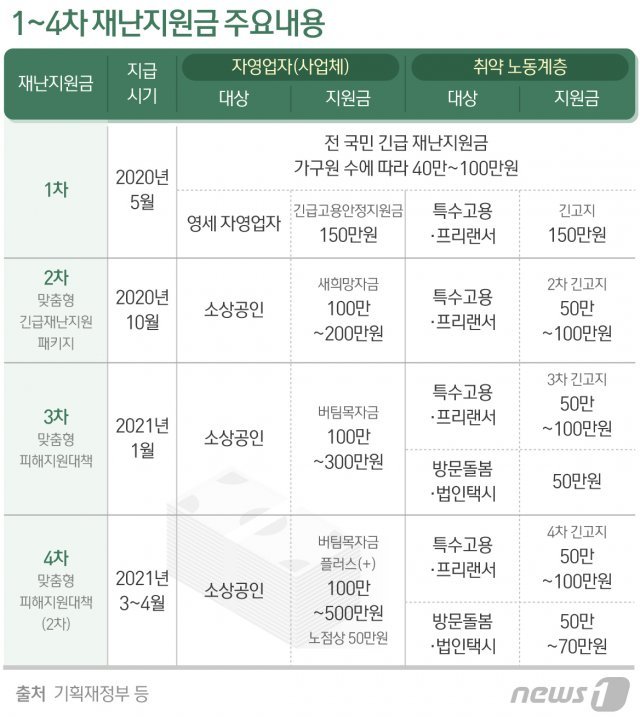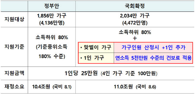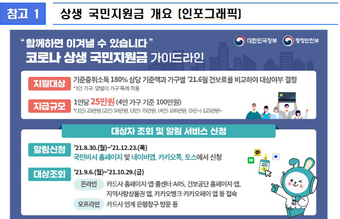 정부는 코로나19 장기화로 경기 침체가 지속되자 지난 2차 추가경정예산(추경)에 소득 하위 80%를 대상으로 1인당 25만원씩 지원하는 내용의 국민지원금을 편성한 바 있다. 1인 가구와 맞벌이 가구에는 특례 기준이 적용돼 전 국민의 88%가 지원금을 받게 된다.