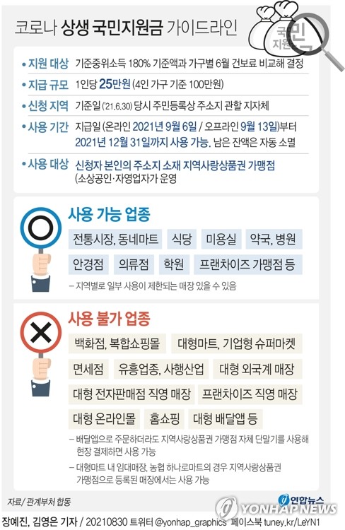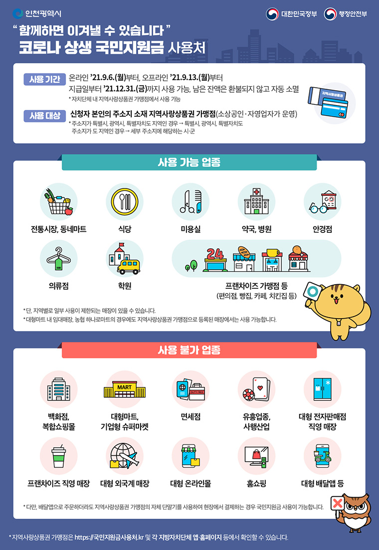 국민지원금은 코로나 장기화에 따른 피해지원과 함께 지역경제 활성화에 도움이 될 수 있도록 사용처와 사용기한을 정했다.