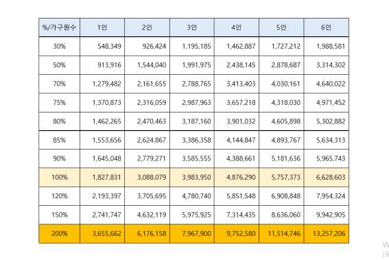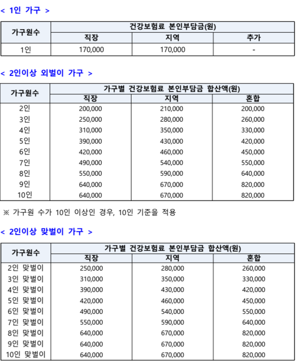 4인 맞벌이 가구 기준으로 보면 직장 가입자는 39만원, 지역가입자는 43만원, 지역가입자와 직장가입자가 혼합된 경우에는 42만원 이하면 국민지원금을 받을 수 있다.