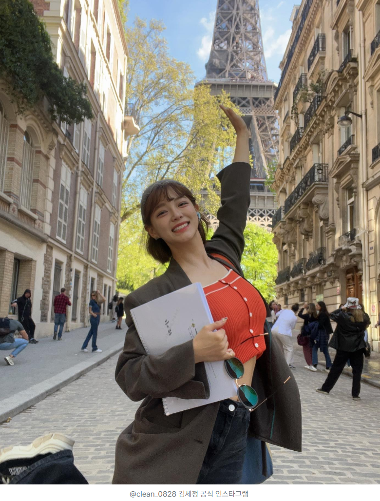 상큼한 단발 머리로 돌아온 배우이자 가수 김세정. 에펠탑 앞에서 낮 밤 모두 인증샷을 남겼습니다. 어 잠깐! 팔에 들고 있는 대본은 뭐지?? 궁금하다~!