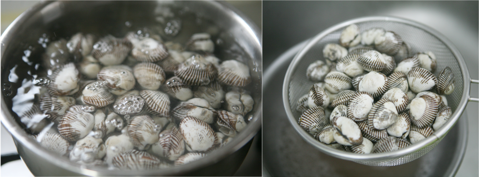 꼬막은 오래 삶으면 육즙이 빠져나가서 살이 쪼그라들고 식감이 질겨지므로 3~4개 정도만 입을 벌리기 시작하면 바로 불을 끄고 체로 밭쳐서 물기를 제거해 주시기 바랍니다. (이때 삶아낸 물은 버리지 마시고 우측 상단 사진처럼 그릇에 따로 모아두세요)