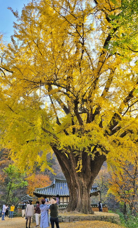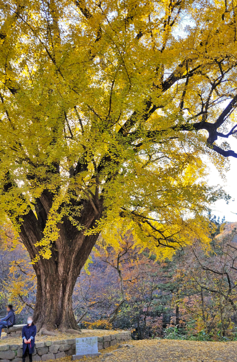 경주 강동면에 위치하고 있는 운곡서원의 은행나무를 보기 위해서 달려왔는데 평일이었지만 사람들이 많았다. 멀리서 보아도 엄청난 위용이 느껴지는 은행나무였다. 위쪽은 노랗게 물들었는데 아래쪽은 아직 파릇파릇해서 시간이 조금 지나면 더 예쁠 것 같았다. 보호수로 지정된 은행나무의 수명은 거의 400년이 다 되어가는 엄청난 크기였다.>
