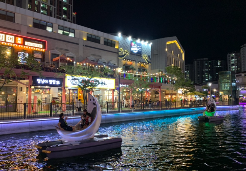 상가의 건물에서 내뿜는 조명과, 수로를 따라 흐르는 조명이 어우러져 만들어내는 야경은 마치 외국에 있는 착각을 불러일으키게 한다.