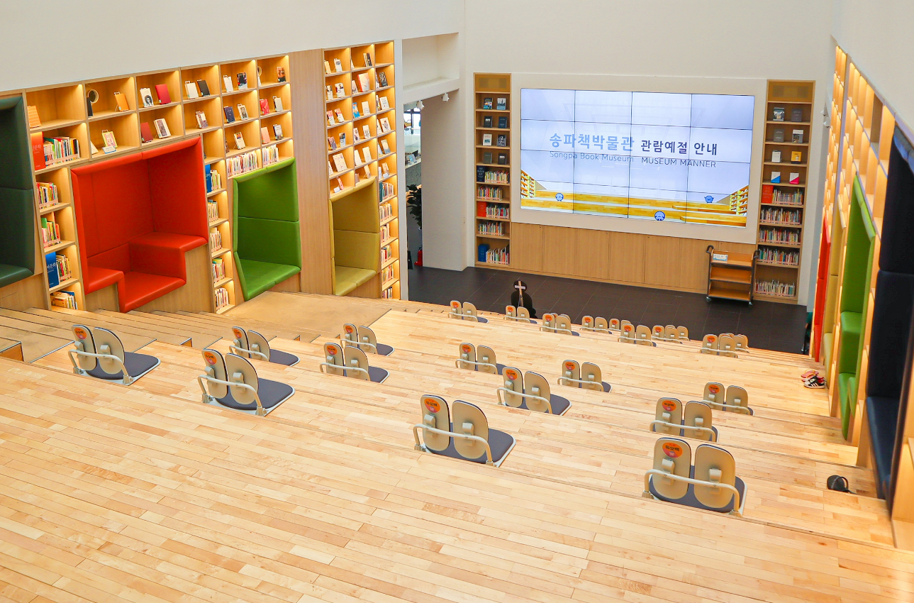 송파책박물관은 책을 마음껏 누릴 수 있는 복합문화공간입니다. 1층과 2층을 연결 지어 계단식 구성을 활용한 어울림홀은 다양한 세대에게 편안한 독서 공간을 제공합니다.