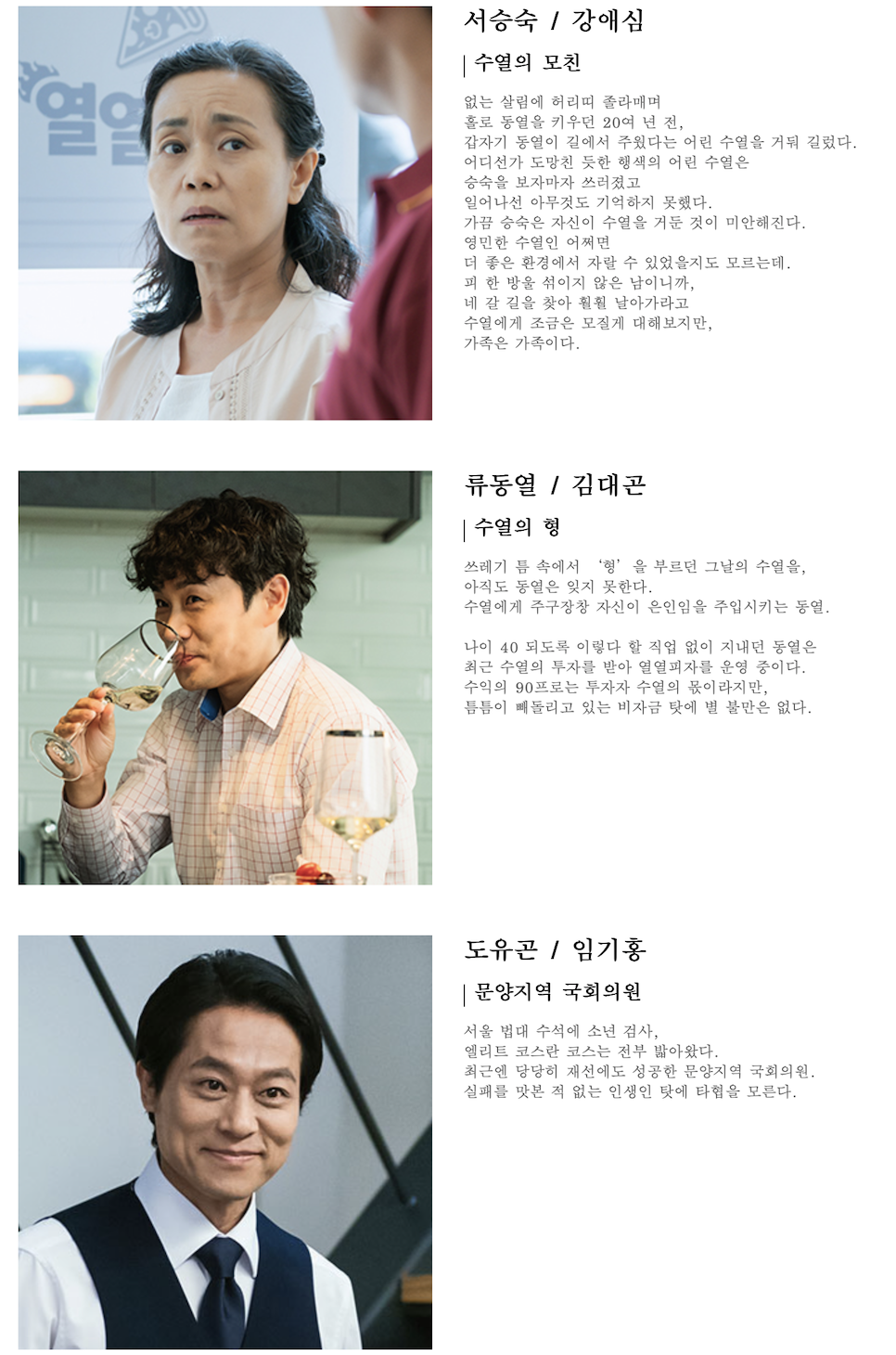 [류동열 / 김대곤] : 수열이의 형. 쓰레기 틈속에서 형이라고 부르던 그날의 수열이를 동열이는 아직 잊지 못한다. 주구장창 은인임을 강조하고있다,