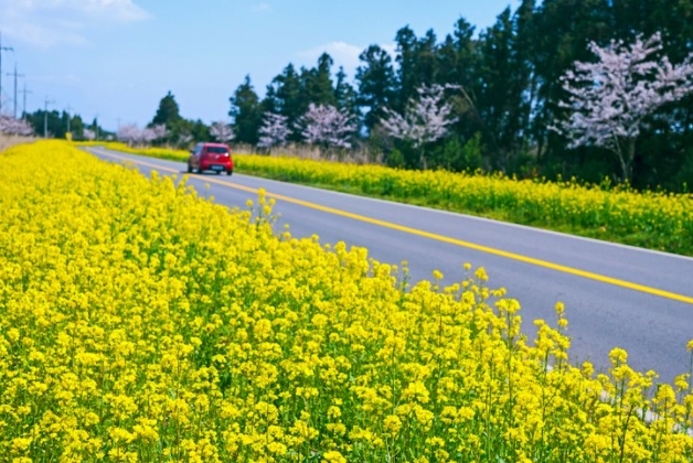 제주에는 이미 유채꽃이 만개했다. 봄이 되면 제주도는 온 섬이 유채꽃으로 뒤덮여 화사함을 뽐낸다. 그중에서도 제주시와 서귀포시를 가로지르는 긴 도로 ‘녹산로’가 으뜸이다. 제주에서 가장 아름다운 길로 꼽히는 이 길은 약 10km에 걸쳐 유채꽃이 끝없이 펼쳐져 있다. 벚꽃이 피면 샛노란 유채꽃과 함께 어우러지는 환상적인 구간도 있다. 벚꽃 만개한 숙소로는 소노캄 제주가 거론된다. 리조트 옆으로 유채꽃밭이 활짝 펼쳐져 있는데, 파란 바다와 노란 유채꽃의 조화가 이국적인 분위기를 한층 고조시킨다.