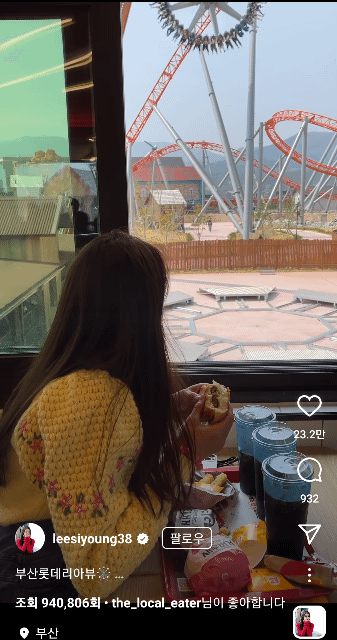 최근 부산 롯데월드에서 핫한 음식점은 다름아닌 햄버거 프랜차이즈인 롯데리아다. 배우 이시영도 최근 자신의 SNS에 "햄버거 잘 안 넘어가는 자리"라는 글과 함께 영상을 올리기도 했다. 이유는 식당 바로 앞에서 운행하는 자이언트 스윙 덕분인데, 어트랙션이 가까워질 때 창가에 닿을 듯 회전하며 지나가는 아슬아슬한 광경을 코앞에서 볼 수 있어 앞으로 색다른 뷰 맛집으로 자리매김할 듯 하다.