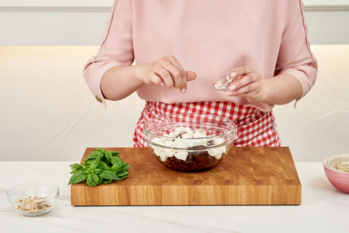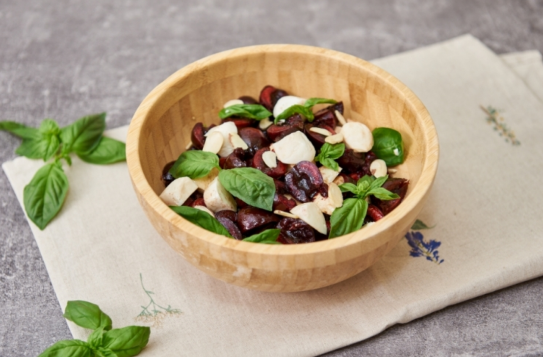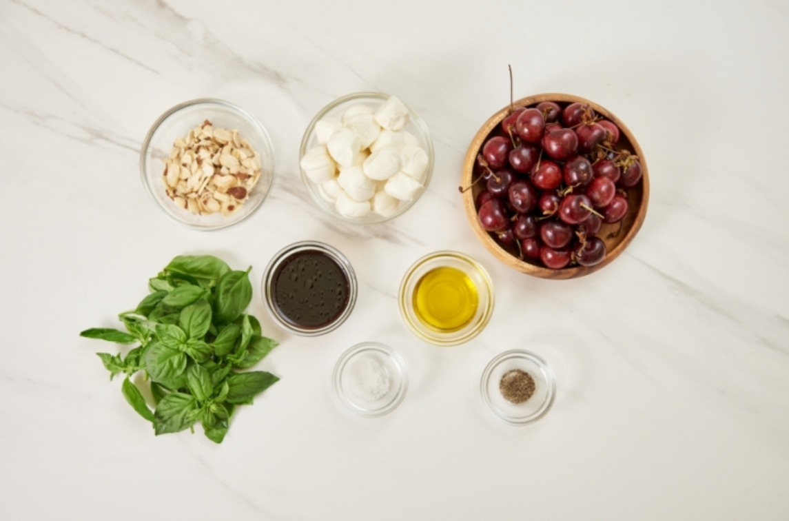 생 체리, 생 바질, 발사믹식초 2큰술, 흑후추와 소금 약간씩, 올리브오일(엑스트라버진) 1큰술, 구운 아몬드 반 컵, 생 모짜렐라 치즈