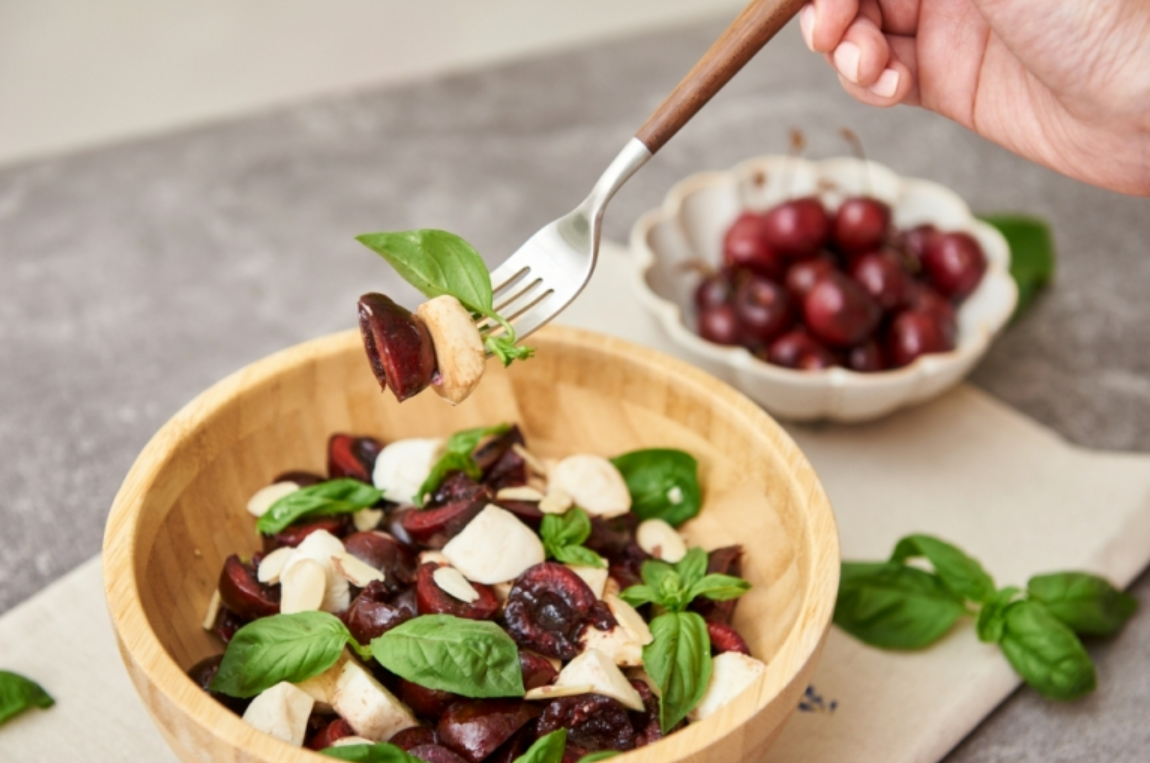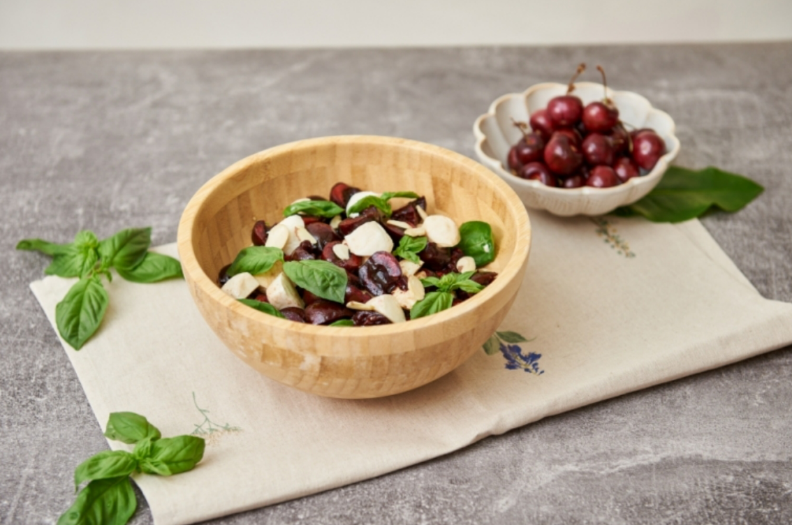 카프레제 샐러드는 재료가 단순해서 만들기가 쉽습니다. 일반적으로는 얇게 저민 토마토와 모짜렐라 치즈, 바질을 교대로 올린 후 엑스트라 버진 올리브오일을 뿌리지만, 토마토를 대신해 제철을 맞은 캘리포니아 체리를 넣으면 새콤달콤한 맛을 즐길 수 있습니다