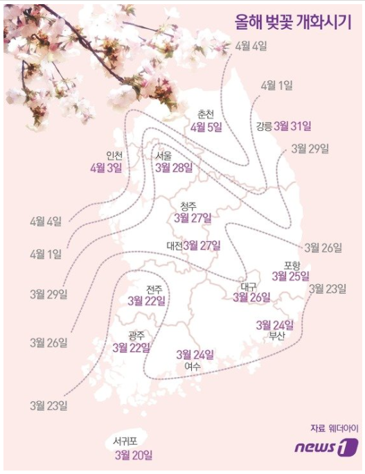 14일 민간 기상업체 웨더아이에 따르면 3월 20일부터 서귀포 지역, 3월 21일부터 28일까지 남부 지역, 3월 27일부터 4월 4일까지 중부 지역, 경기 북부와 북부 지역에서 벚꽃이 피기 시작했다. 강원도와 산간지방은 4월 5일 이후 개화할 예정이다.
