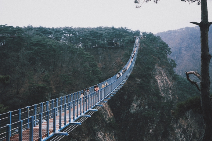 출렁다리까지 올라가는 데크 계단은 모두 578개. 계단을 오르면서 끊임없이 보게 되는 ‘578/60 건강수명 4분 UP, DOWN 9kcal’ 알림 표시 덕분에 578개의 계단을 기억하는 것은 그리 어렵지 않다. 578개의 계단을 다 오르면 38분 30초의 건강 수명이 연장되고, 86.7kcal가 줄어든다. 원주 소금산 출렁다리는 tvN 드라마 <사이코지만 괜찮아>의 촬영지이기도 하다. 김수현이 소금산 출렁다리에서 서예지에게한 “그냥~높고 탁 트인데, 한 번쯤 와보고 싶었어.”라는 대사로 유명한 곳이다. 출렁다리를 건너는 입구에 드라마 촬영 장면이 소개되어 있다. 100m 높이의 출렁다리를 건너면서 아래를 내려다보지 않고 가장자리로 걷는 사람이 있는가 하면, 구멍이 뚫려 훤히 내려다보이는 중간으로 거침없이 걸어가는 사람이 있다. 일부는 다리 중간에서 새로 개통한 울렁다리를 배경으로 기념촬영을 하는 사람까지 모두 제각각의 모습으로 출렁다리를 즐기는 모습이다.