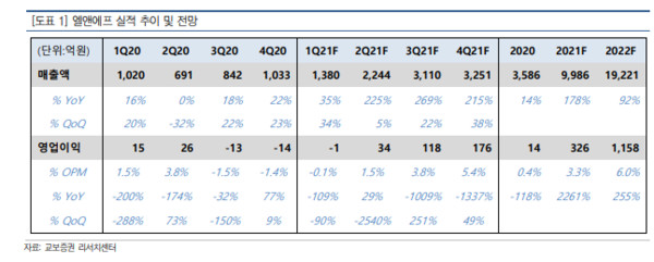 이날 에프앤가이드에 따르면 올해 엘앤에프의 연간 영업이익은 305억 원으로 전년 대비 1,930% 급증할 것으로 전망된다.