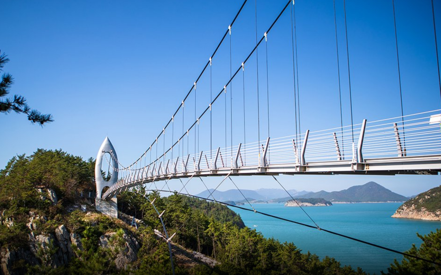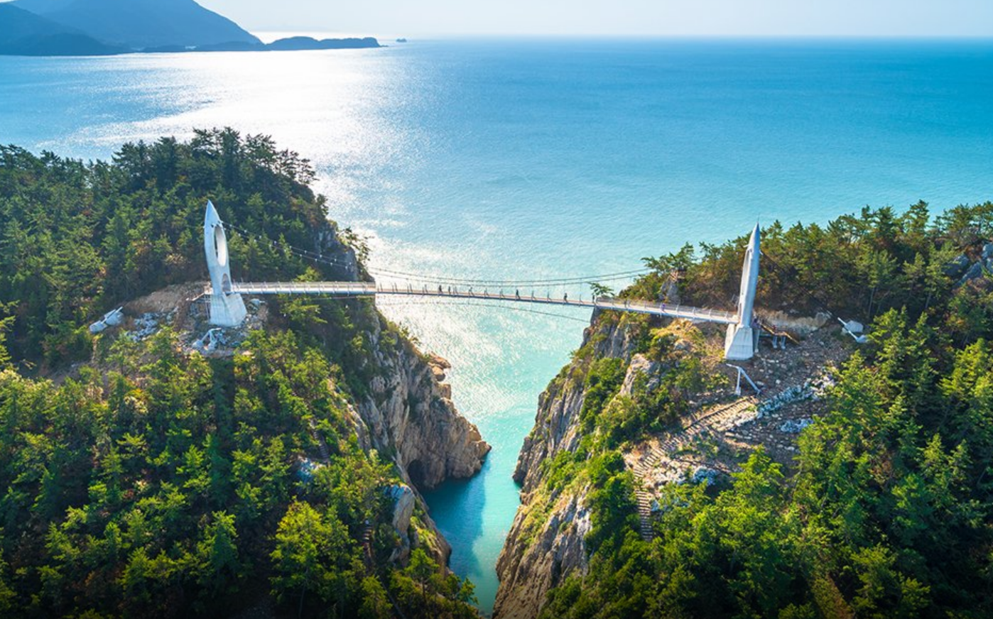 섬의 가장 왼쪽 깻넘전망대와 막산전망대 사이, 움푹 들어간 해안절벽이 보입니다. 이 위를 연결하는 다리가 바로 꽃섬 출렁다리 입니다.