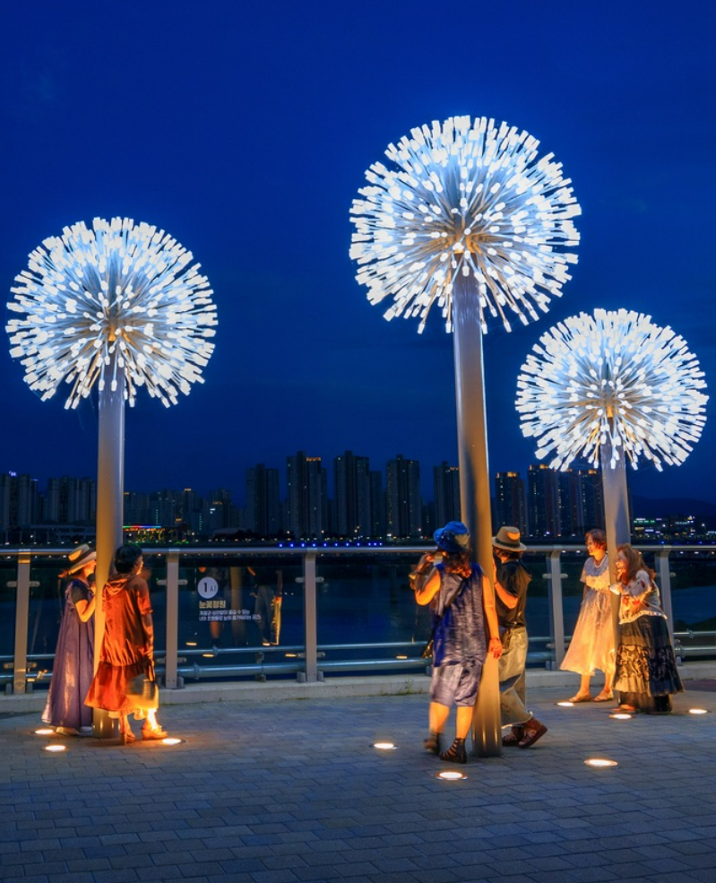 특히 밤이 되면 낙하분수쇼가 시작되는데 금강으로 빛을 내며 떨어지는 분수 물줄기가 장관이다. 하얀 산수국이 활짝 핀 화단을 지나면 ‘10시 빛의 해먹’. 도넛 모양 하얀 해먹은 낮에도 예쁘지만 밤이면 LED가 켜지고 그네처럼 앞뒤로 움직여 환상적인 공간을 연출한다. ‘11시 황혼의 쉼터’에서는 저물녘 그네에 앉아 금강 위로 떨어지는 붉은 노을을 즐길 수 있다.