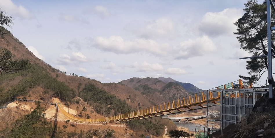충남 금산군 제원면 천내리 금강 상류의 아름다운 수변 경관을 한눈에 조망할 수 있는 '월영산 출렁다리'의 건설 공사가 진행되고 있다.