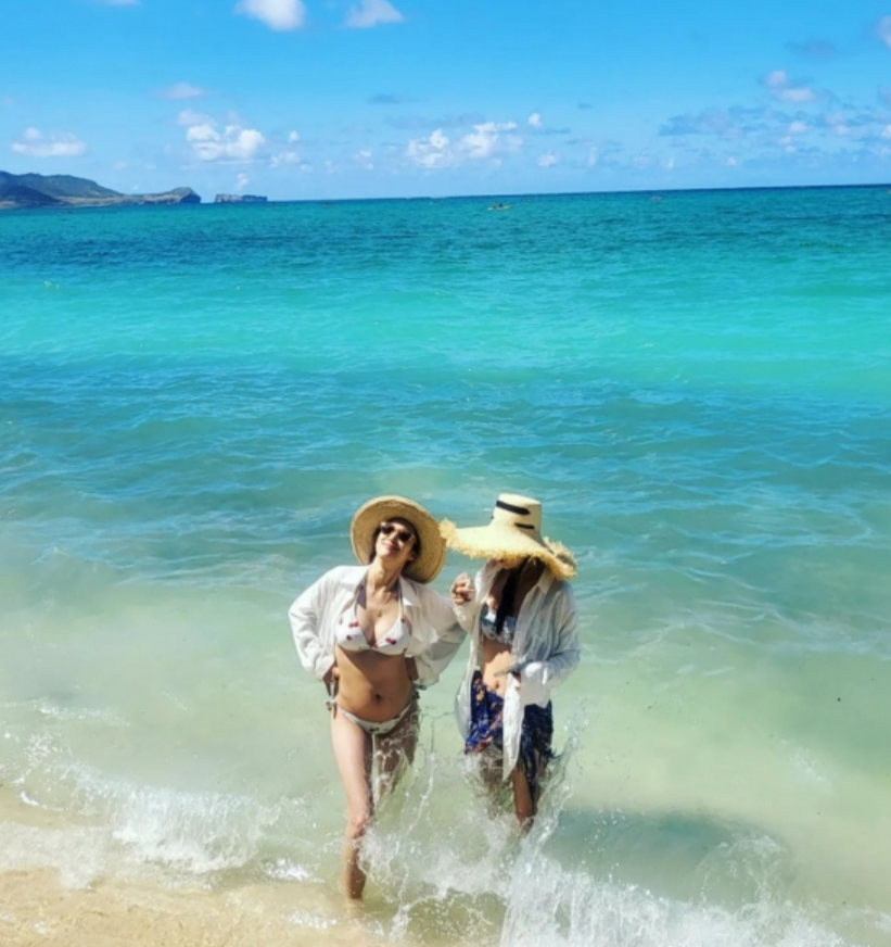 공개된 사진 속 전혜빈은 하와이의 푸른 모래사장에서 비키니를 입고 물놀이를 하러 나온 사진을 찍고 있다.