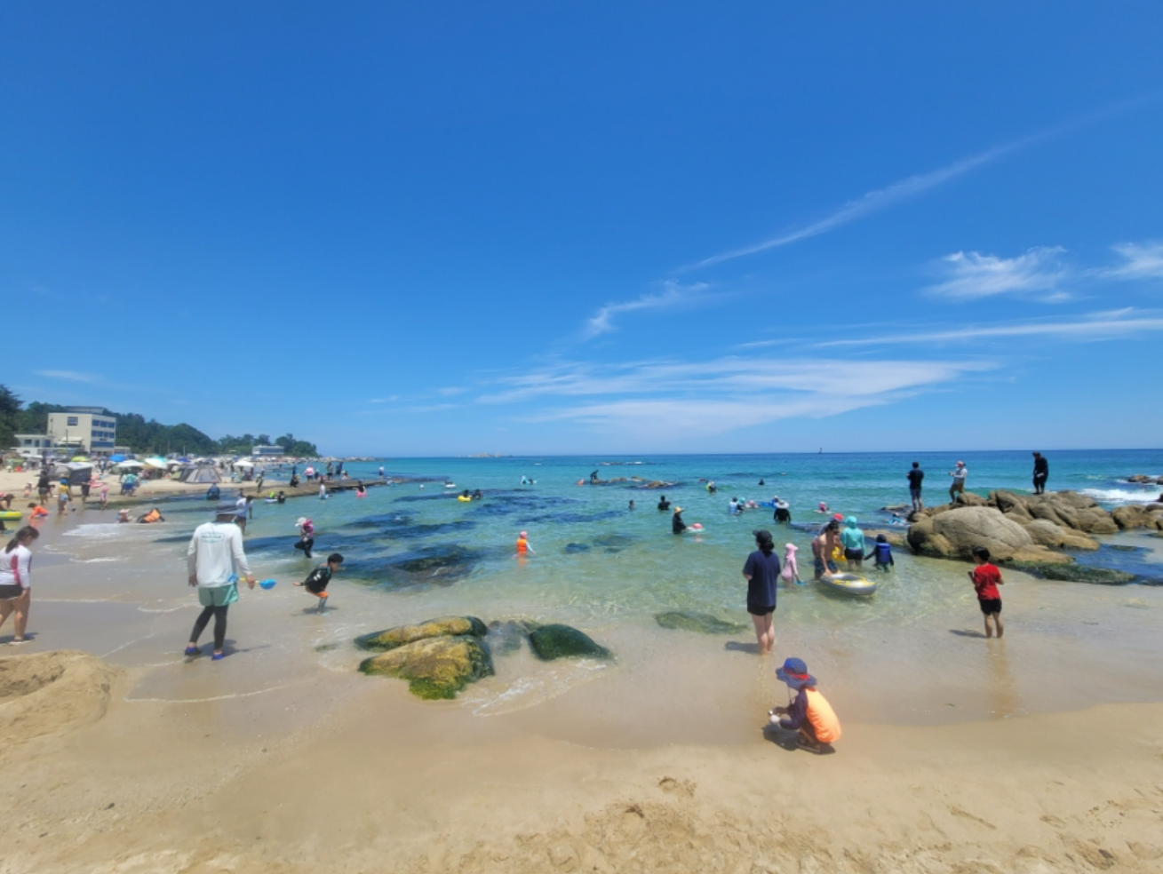 물놀이 하기 좋아서 피서지로 인기인 아야진해변. 맑고 투명한 바다와 백사장이 어우러져 해외 부럽지 않은 풍경이었습니다. 바다물이 너무 아름다워 이곳에서 평상을 대여를 할 수 있는데요 평상 대여비 50,000원, 튜브 10,000원 안전을 위한
