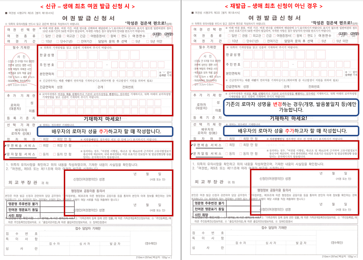 지역 구청에 방문하시면 여권발급 신청서가 비치되어 있습니다. 신규 발급과 재발급의 경우를 달리해서 제출하는데요. 재발급 신청자의 경우 기존 로마자로 기입하고 싶을 경우, 적지 않아도 된다는 차이 정도입니다.