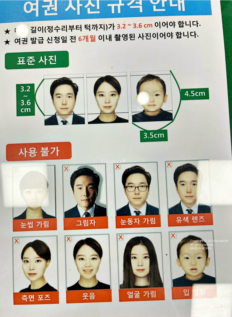 여권을 만들려면 우선 여권용 사진이 필요하겠죠? 여권용 사진은 여권법 시행령 제5조에 의거하여 6개월 내 촬영한 가로 3.5cm, 세로 4.5cm 크기로 균일한 흰색 바탕에 어깨와 얼굴이 정면을 보고 있는 사진이어야 합니다.
