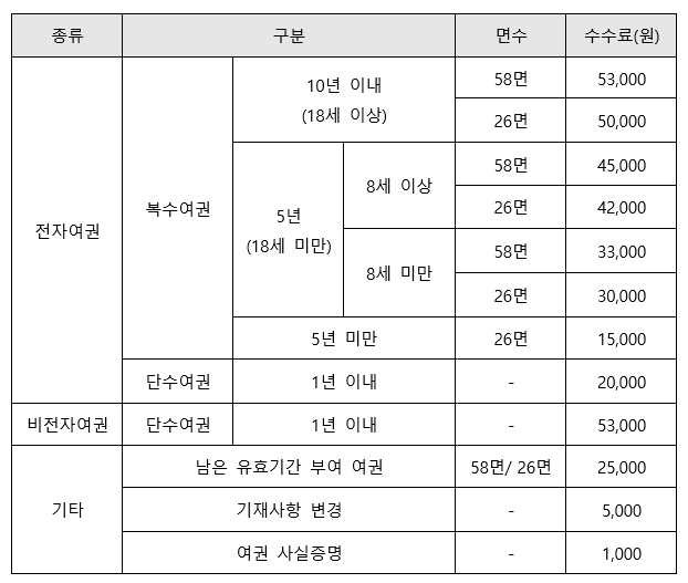 여권 수수료는 종류와 기간, 면수에 따라 차이가 있습니다.