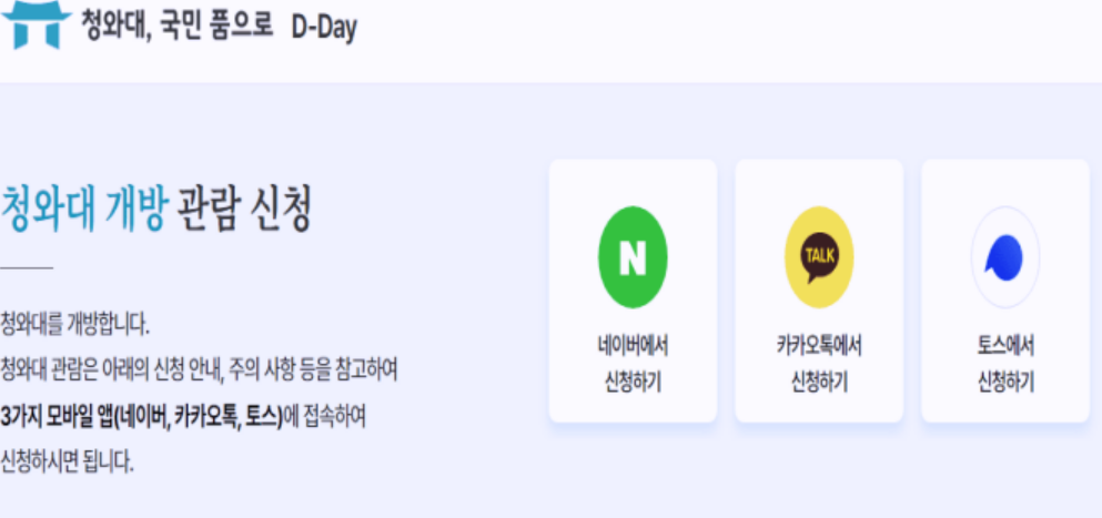 홈페이지에 접속하여 청와대 관람신청을 눌러 주면 네이버, 카카오, 토스 3가지 종류의 어플 중 자신이 평상시 사용하여 익숙한 대상을 선택하여 예약 신청합니다.