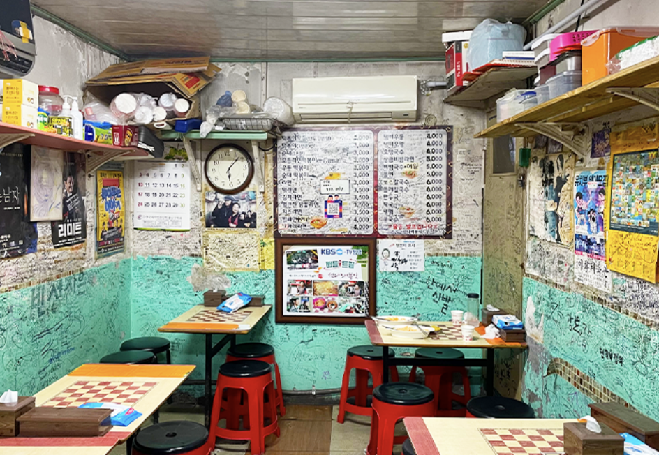 문을 열고 들어가면, 세월의 흔적이 느껴지는 벽면의 낙서들이 눈에 띈다. 대학로이다 보니 연극 포스터도 여러 개 붙어 있다. 이곳의 인기 메뉴는 만두와 김밥, 계란이 포함되어 있는 떡볶이 모둠과 기본 떡볶이, 그리고 순대 떡볶이다.