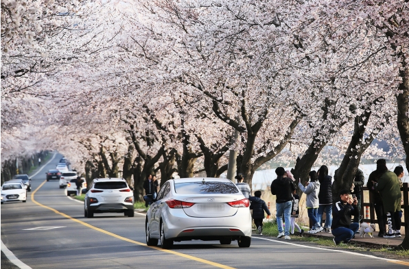 벚꽃길 풍경 해양성 기후로 인해 이곳의 벚꽃은 수도권 및 남부지방보다 늦게 개화하기 때문에 올해는 9일부터 14일까지가 절정을 맞이할 것으로 예상된다.