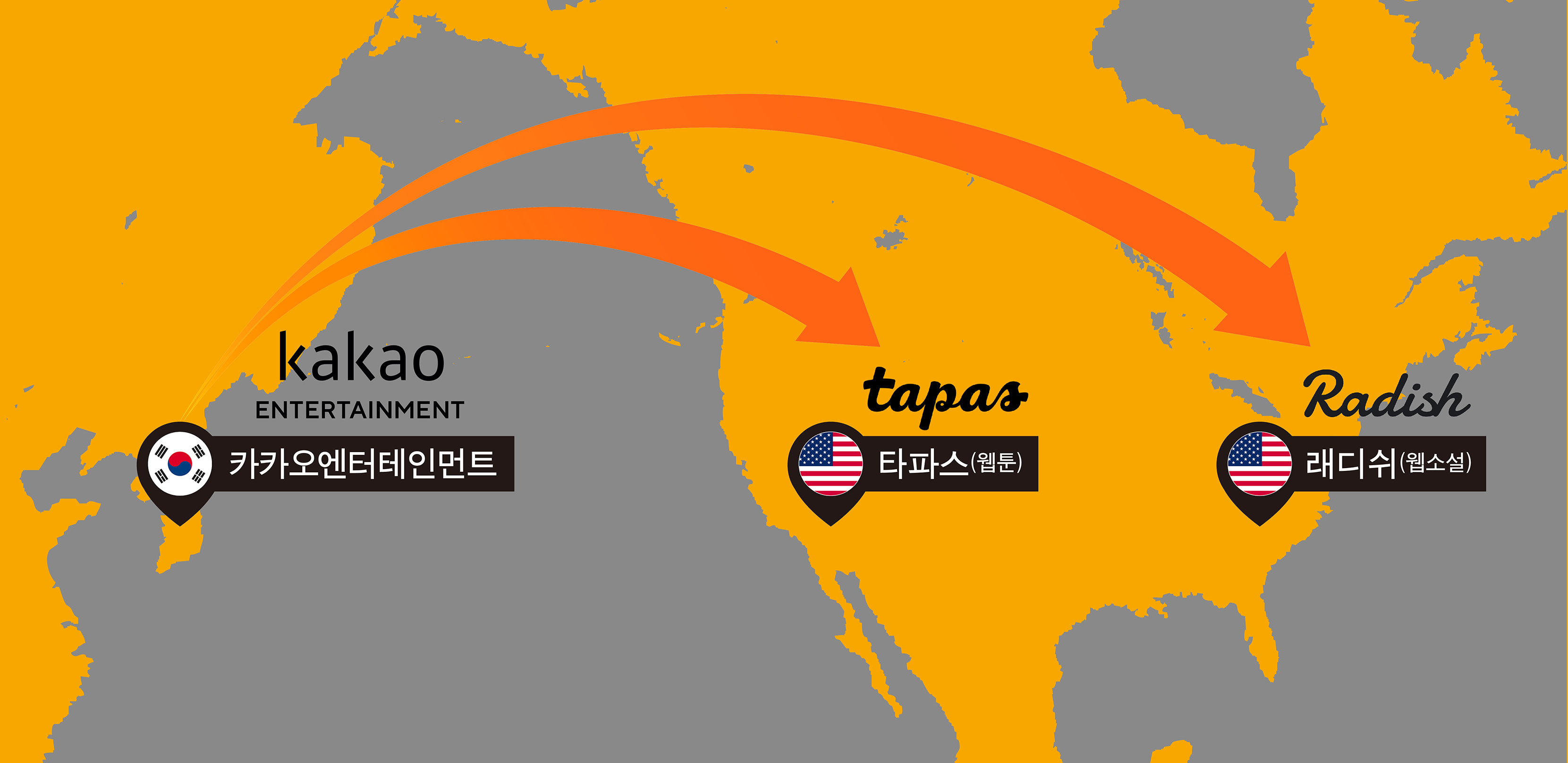 카카오엔터테인먼트는 래디쉬와 타파스 등 웹툰·웹소설 플랫폼을 인수하며 해외 시장 진출에도 가속 페달을 밟고 있다.