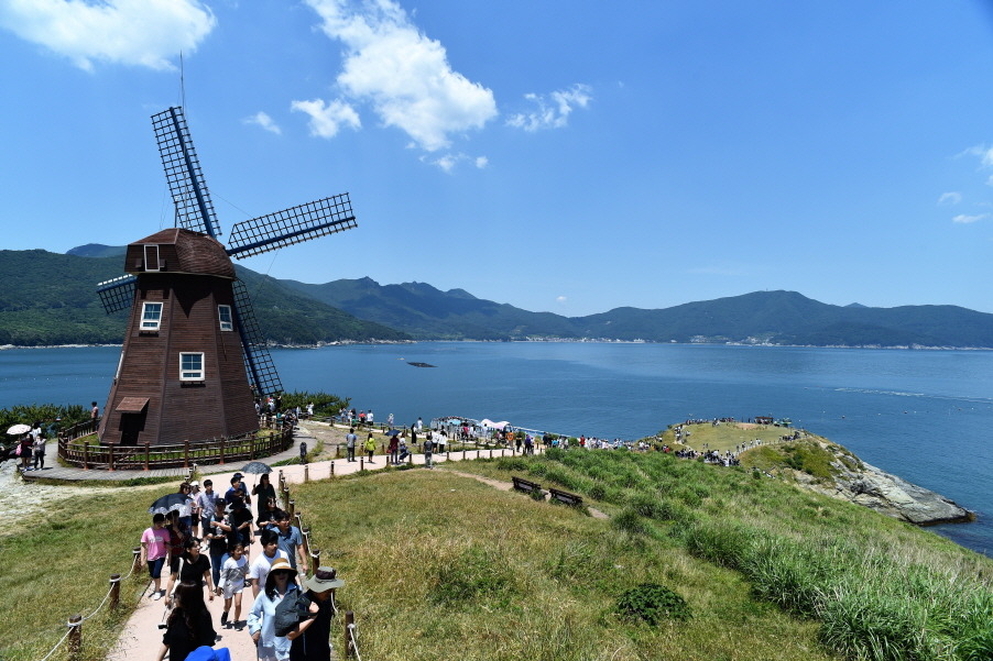 거제 가볼만한곳 제6경 바람의 언덕은 중국 원나라와 일본 쪽으로 수출했던 도자기 보관 창고가 있어서 '도장포'라고 부르는 마을에 위치한다. 근처에 자리한 신선대 입구에서도 구경할 수 있는 풍차가 사진 찍기 좋은 명소로 유명하게 만들었다. 드넓은 바다를 마주하고 있는 언덕에 위치하여 이국적인 풍경을 연출한다.