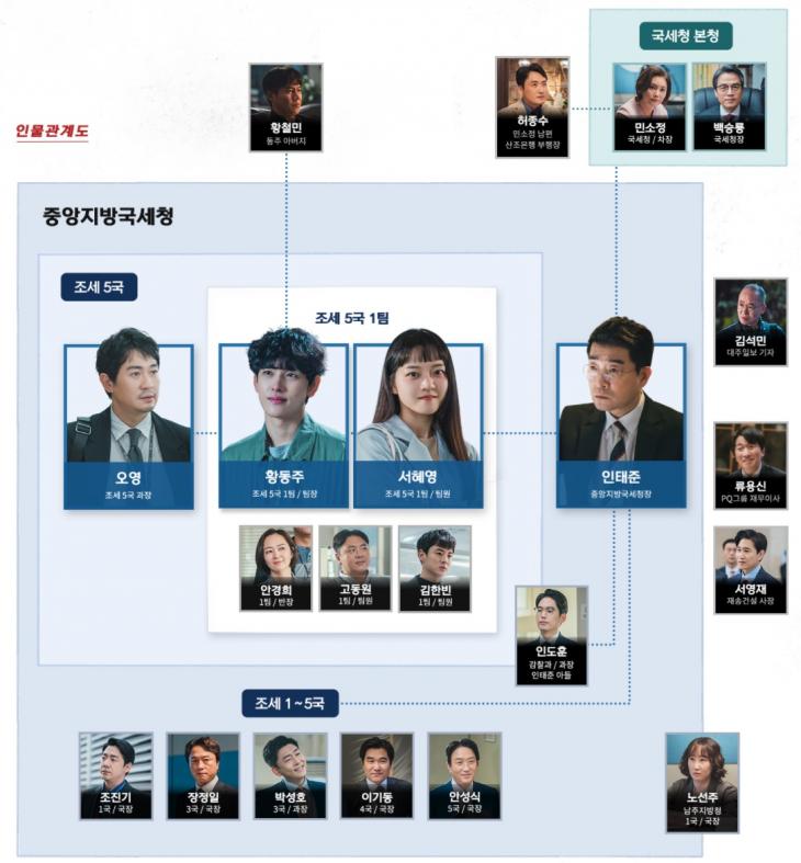 인물관계도를 살펴보면 중앙지방국세청 높은 사람으로 손현주가 보이고, 그 밑에 조세 1국부터 조세 5국까지 있는데, 우리의 이야기는 바로 5국에 있는 사람들의 이야기일 것 같다. 조세 5국 과정으로 박용우가 있고, 그 밑에 주인공 황동주 그리고 서혜영이 보인다. ^^ 어떤 스토리로 시청자들을 사로잡을지~ 오늘 첫방송을 보면서 한 번 잘 지켜봐야겠다.