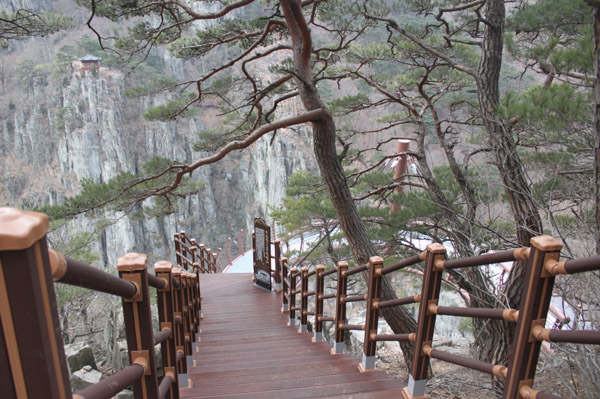 하나는 깎아지른 듯한 절벽 위에 위태롭게 서 있는 팔각정자(선일대, 해발 298m)이고