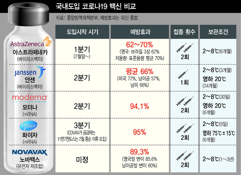 아스트라제네카와 얀센이 60%대의 예방률을 보이는 반면 화이자 모더나 백신의 예방률은 90% 이상 높다.