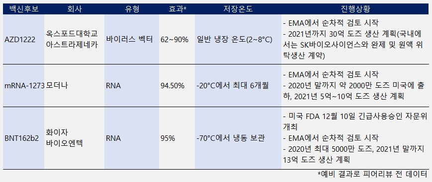 화이자는 영하 90도에서 영하 60도 내에서 보관해야 해서 특수 장치가 없으면 운반이 어려운 단점이 있으며,
